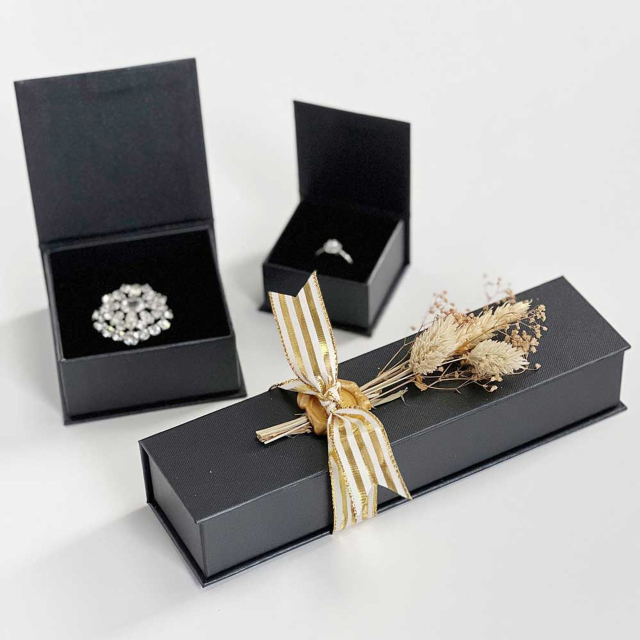 A deluxe jewellery box. Pebble embossed, pearlized tarnish-resistant hinged magnetic boxes. Flocked foam inserts allow for three rings, earrings, and/or a necklace. Recyclable upon removal of foam inserts.